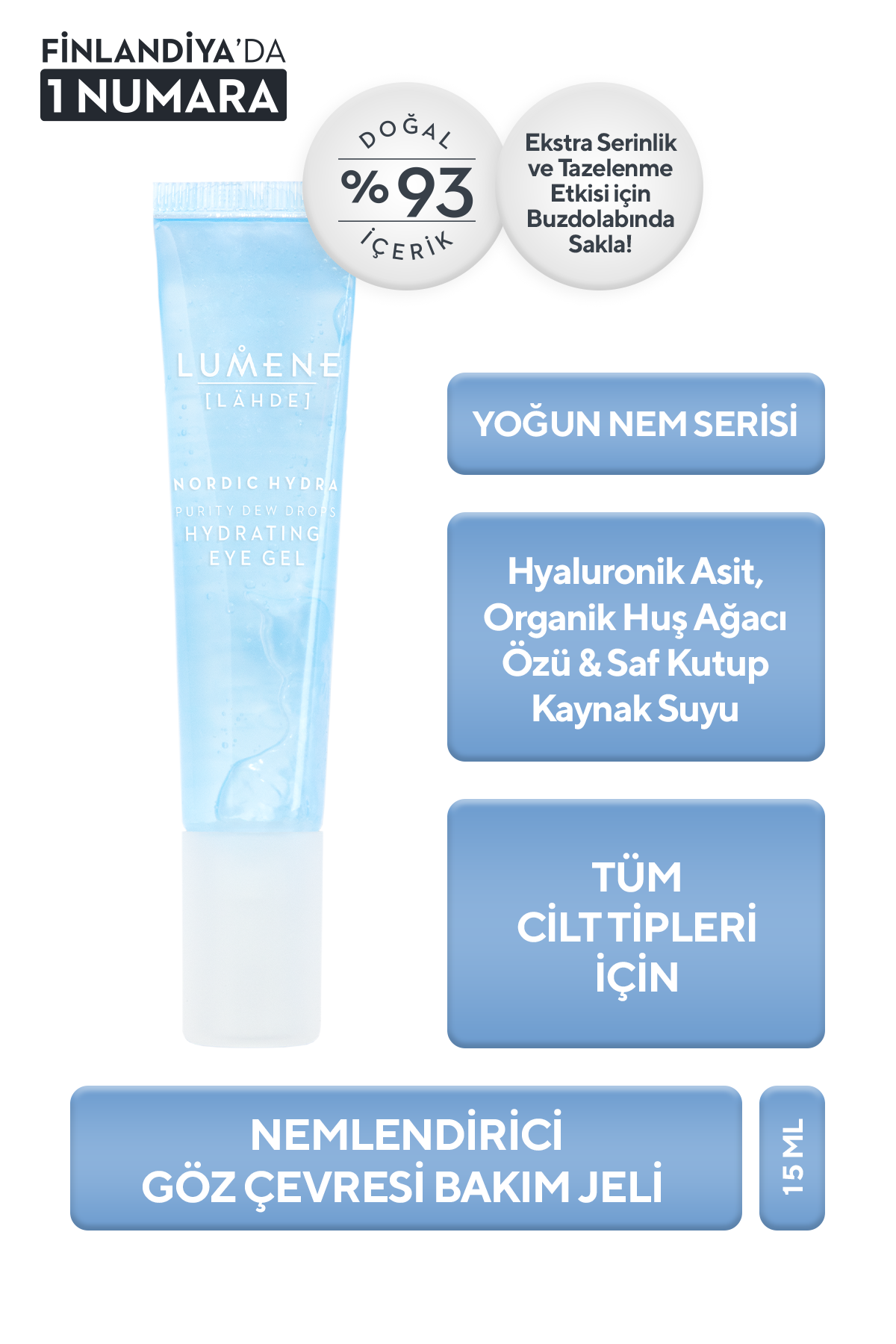 Göz çevresini nemlendiren, şişkinlik ve göz altı halkalarının görünümünü azaltan, kokusuz hafif jel.
