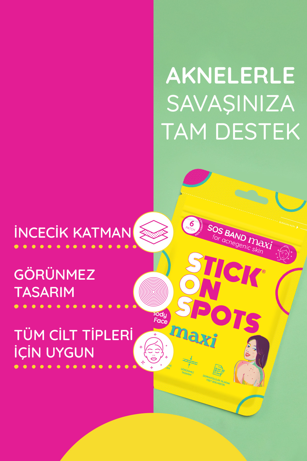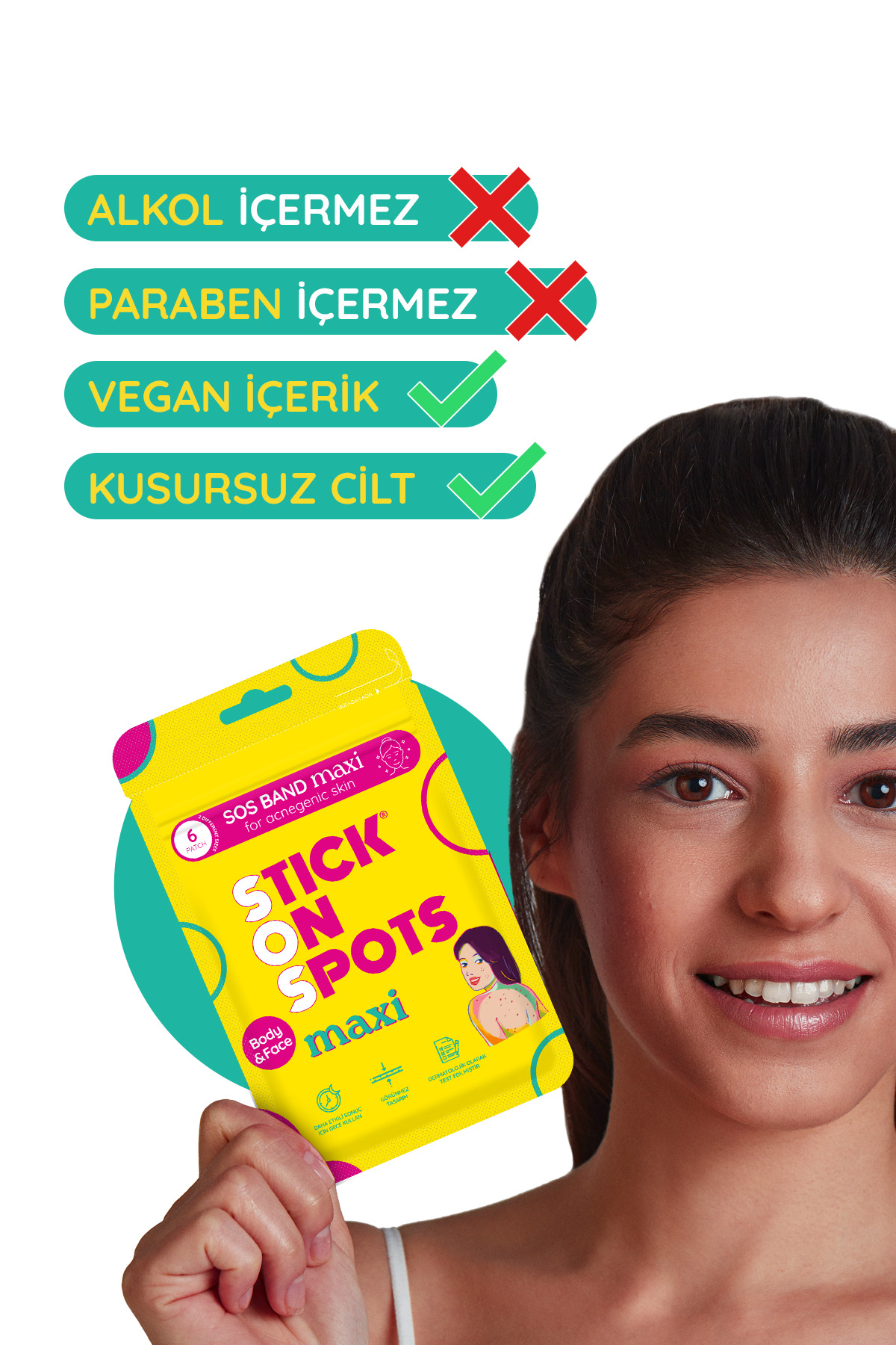 Stick On Spots SOS Band Body, sırt, göğüs ve omuz gibi vücudun geniş bölgelerinde çıkan akne ve problemli alanlar için özel olarak tasarlanmış 6 adet sivilce/akne bandı içerir.