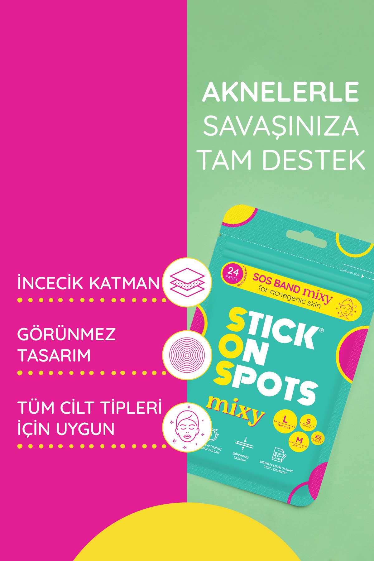 Stick On Spots SOS Band Mixy, yüz ve vücutta farklı boyutlardaki akne ve problemli bölgeler için özel olarak tasarlanmış karışık boyutlarda sivilce/akne bantları içerir.